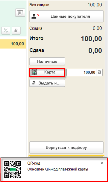 После сканирования кода на кнопке Карта отобразится иконка в виде QR-кода, благодаря чему кассир сможет убедиться,