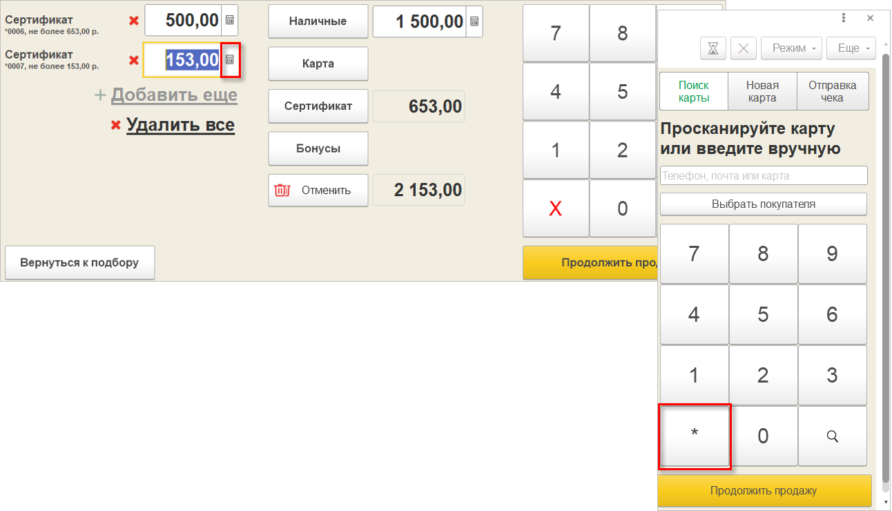 У кассира появилось еще больше возможностей ввода информации на сенсорном экране без использования физической клавиатуры. Теперь с цифровой клавиатуры на форме РМК можно ввести номер карты или телефона, а также дату рождения.
