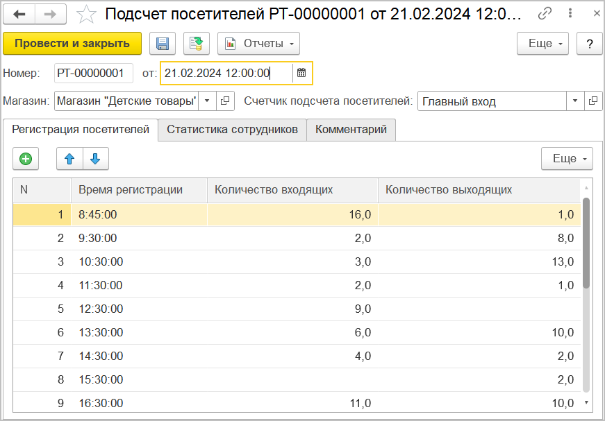 Регистрация количества посетителей производится документом "Подсчет посетителей", который можно ввести вручную или сформировать автоматически при загрузке данных со счетчиков прохода.