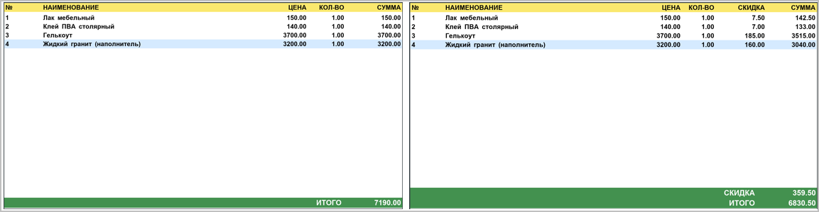 Список товаров в удобном формате, в том числе со скидкой и итоговой суммой: