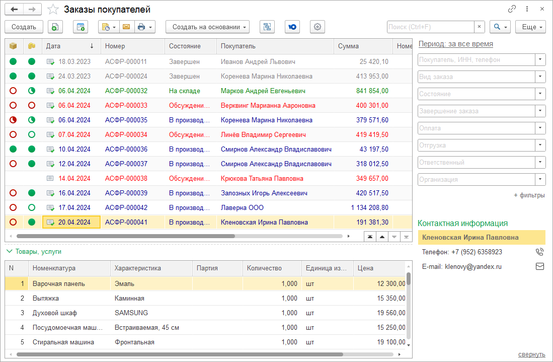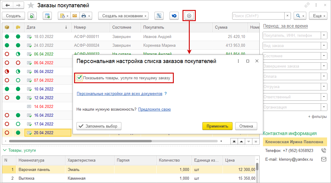 Состав заказа покупателя можно просматривать в списке документов, не открывая заказ.