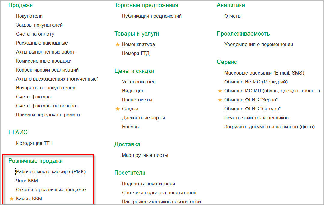 Теперь открыть список ККМ удобнее и проще. Добавлена ссылка на кассы в раздел "Розничные продажи". Добавлять и настраивать кассу можно из раздела, где работаем с розничными продажами.