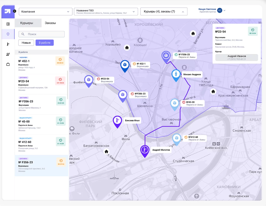 На сайте можно отслеживать местоположения и активность курьеров в режиме реального времени.