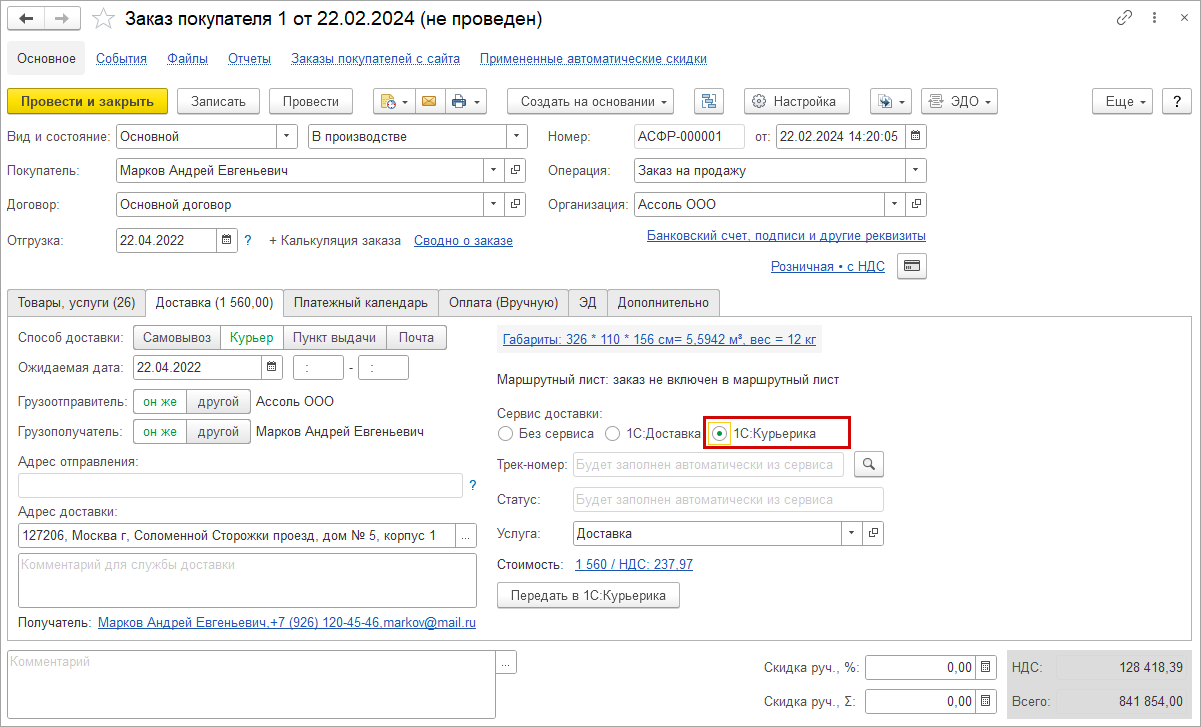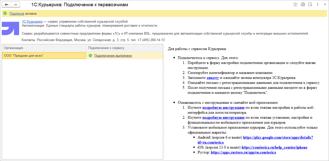 Появилась интеграция с сервисом "1С-Курьерика". Сервис предназначен для управления собственной курьерской службой: от получения до передачи заказа клиенту. Состоит из веб-интерфейса логиста и мобильного приложения для курьера. Менеджер доставки или логист из веб-интерфейса создает и редактирует заказы, назначает курьеров и отслеживает их работу на карте, вовремя реагирует на непредвиденные обстоятельства. Курьер в приложении просматривает список заказов, планирует маршрут доставки до подъезда и формирует отчет за смену. При настроенной интеграции на основании документов в программе "Заказ покупателя", "Заказ поставщику", "Приходная накладная", "Расходная накладная", "Чек ККМ" можно создать заказ на доставку в сервисе.
