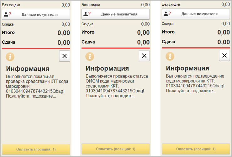 Добавление марки в сессию ККТ сопровождается следующими сообщениями: