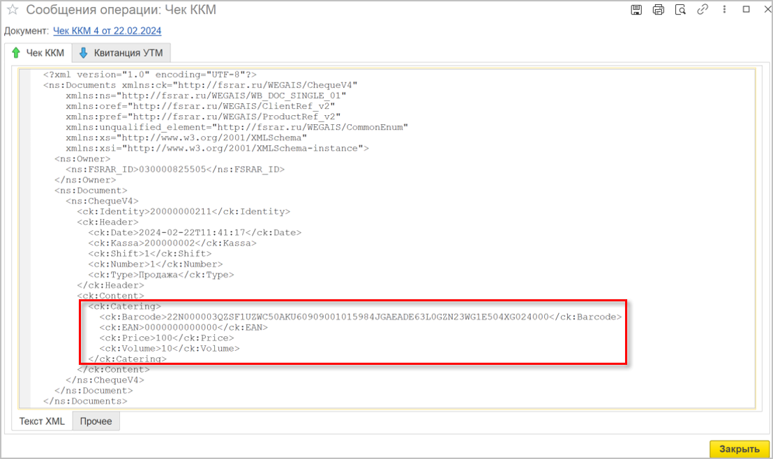 На рисунке ниже пример "Чека ЕГАИС" с частичным выбытием.
