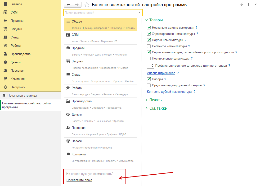 Если не нашли подходящую возможность в программе, можно сразу оставить свои пожелания для реализации из раздела "Еще больше возможностей". Добавили в блок "Еще больше возможностей" ссылку "Предложить свою", по которой можно написать свою идею новой возможности.