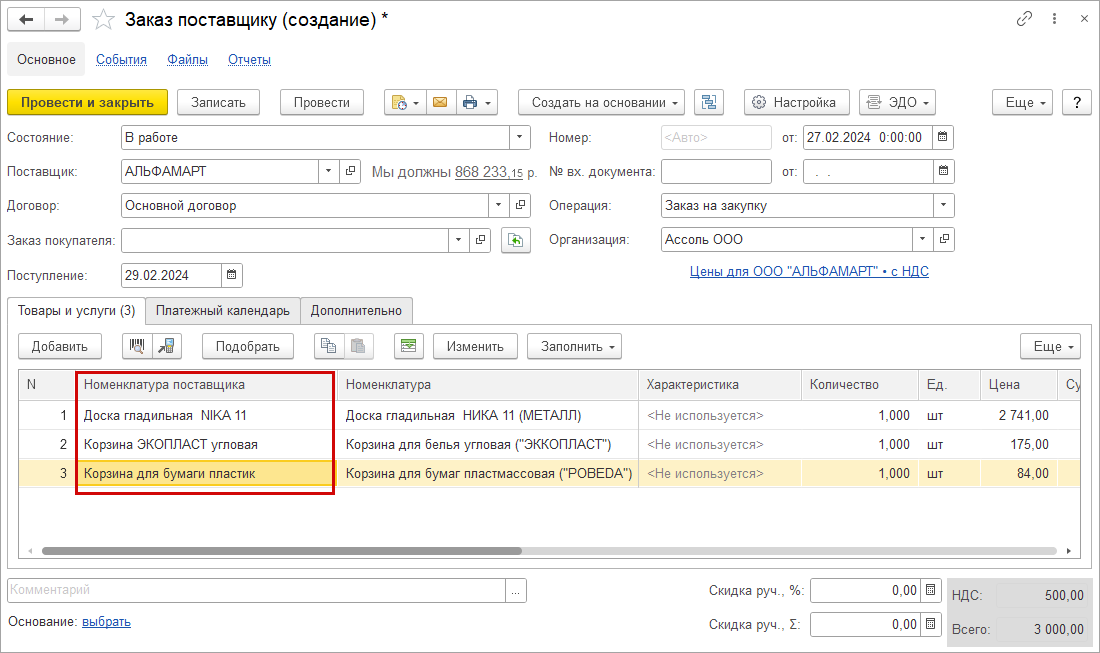 Искать товары также можно по штрихкоду, если найдено единственное соответствие, то номенклатура поставщика заполнится автоматически.