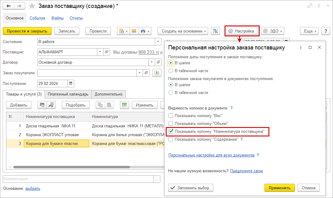 Колонка "Номенклатура поставщика" отображается при включенной настройке в документе, а также настройке учета "Номенклатура поставщиков".