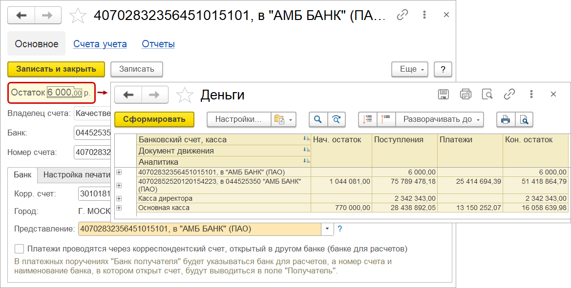 В карточке счета и кассы также доступна информация с остатком, по ссылке можно открыть отчет движения денег с полной информацией об остатках и движениях.