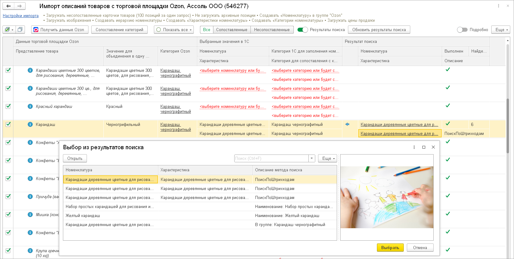 В форме импорта появился режим "Результат поиска" для простого и удобного сопоставления имеющихся товаров 1С с описаниями товаров Ozon.