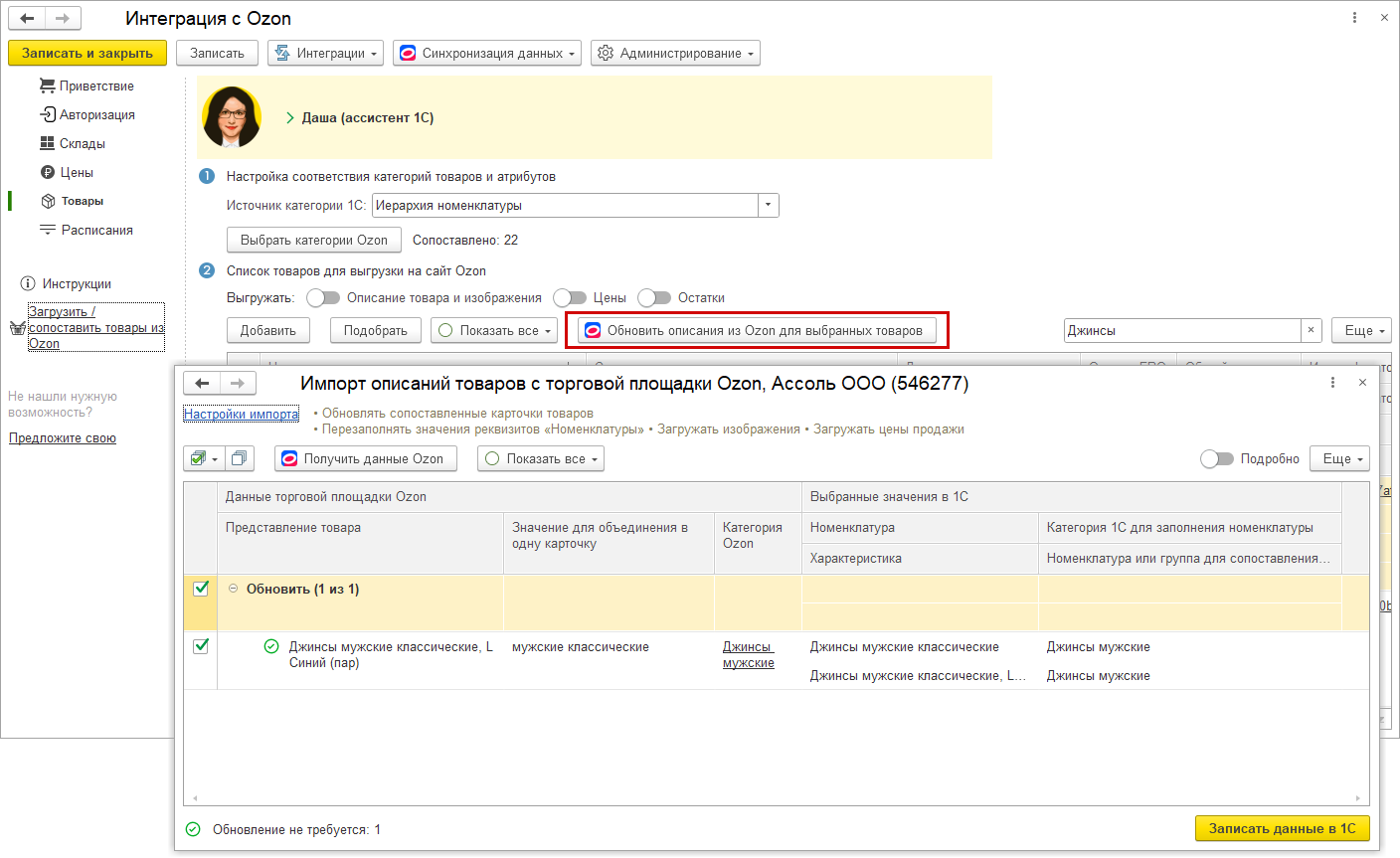 Также дополнены возможности обновления информации в существующих карточках товаров 1С по кнопке "Обновить описания из Ozon для выбранных товаров".