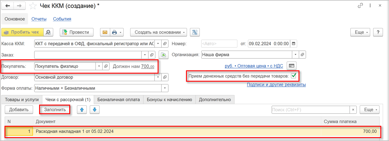 В первом сценарии без РМК в документе "Чек ККМ" выбираем покупателя и включить флажок "Прием денежных средств без передачи товаров", после чего отобразится вкладка "Чеки с рассрочкой". Здесь подбираем расходную накладную. По кнопке "Заполнить" подбор документов происходит автоматически с учетом задолженности выбранного покупателя.
