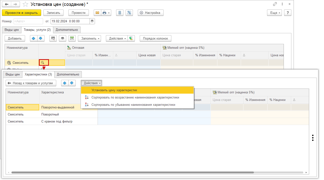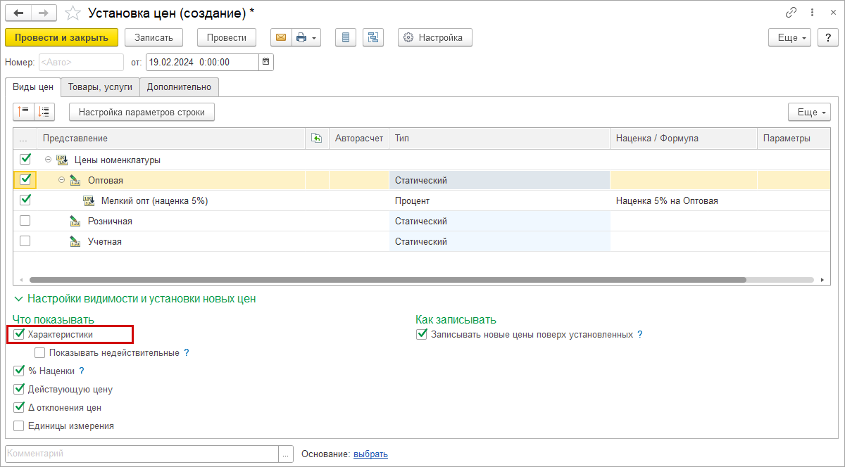 Для перехода к установке цен характеристик в настройках документа "Установка цен" включаем настройку "Что показывать: Характеристики".