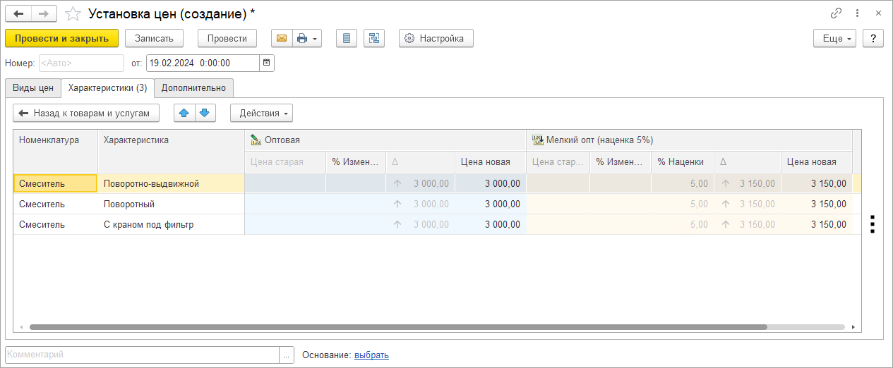 В результате для всех выбранных характеристик товара заполняется цена. Теперь можно провести документ, цены установлены.