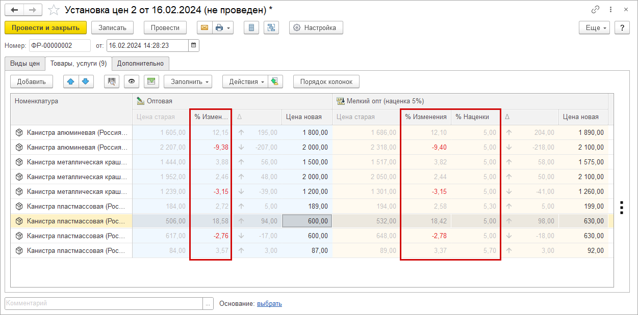 Теперь в режиме редактирования отображаются процент изменения цены и процент наценки на базовую цену. Стало удобнее отслеживать динамику изменения цен в процентах без перехода в отчеты. Отрицательная динамика отображается красным цветом.