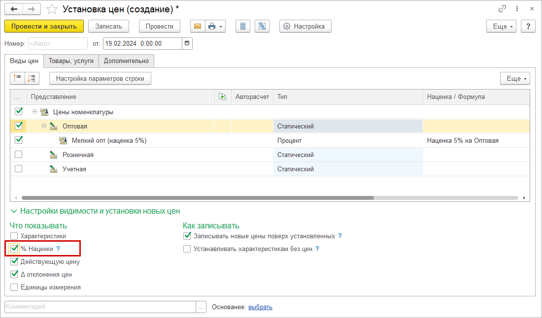Колонка "% Наценки" отображается только для зависимых цен, рассчитываемых от базовой цены. Отображение колонки настраивается с помощью флажка на закладке "Виды цен" документа "Установка цен".