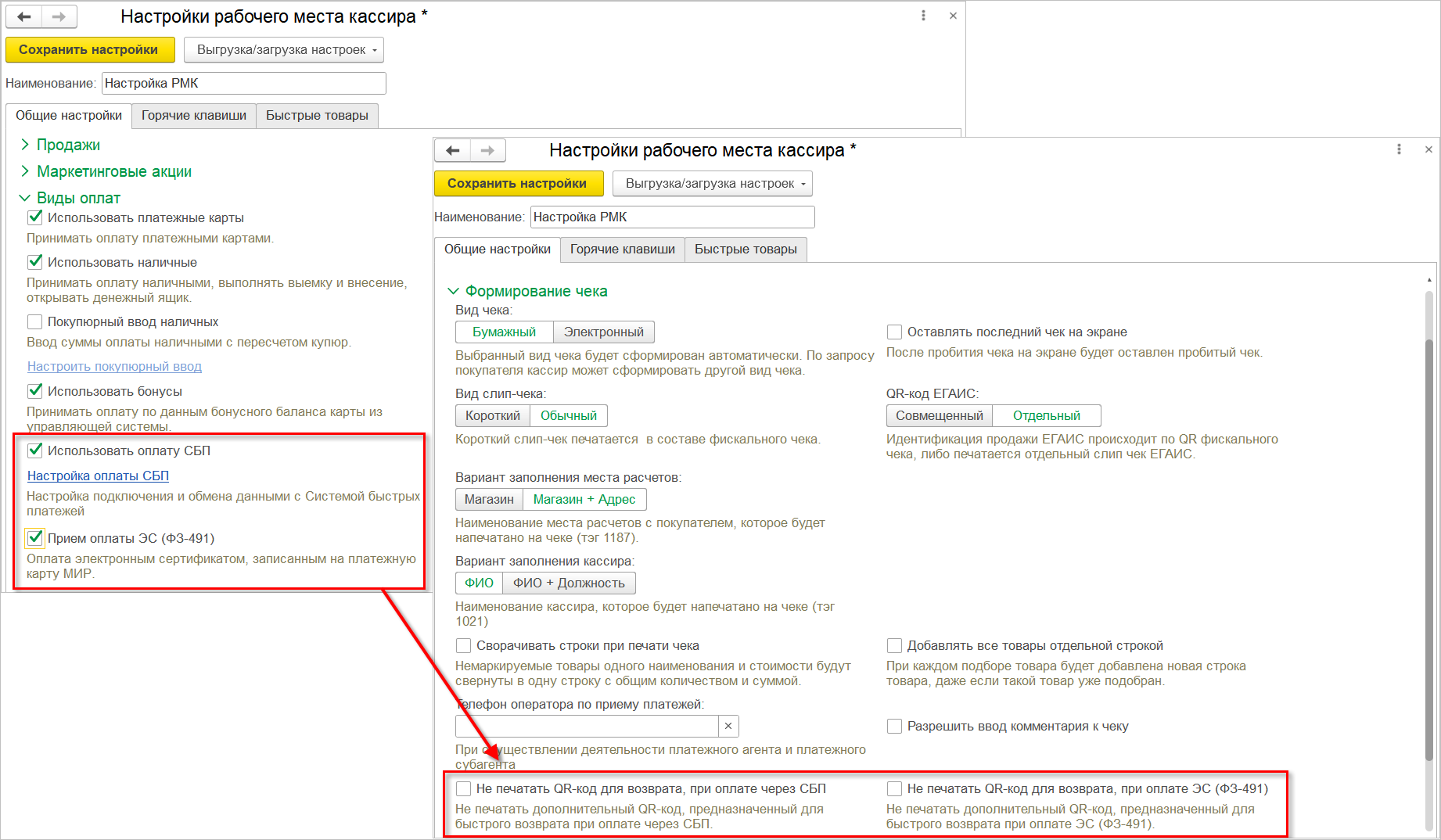 Настройка чеков. В чеке теперь можно регулировать вывод QR-кода для быстрого возврата товаров, оплаченных с помощью СБП или ЭС (ФЗ-491). Для этого в раздел "Формирование чека" добавлены одноименные опции. Их доступность зависит от используемых видов оплат.