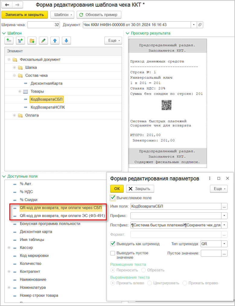 QR-код для возврата можно отображать и при использовании шаблона печати чека продажи. Для этого в шаблоне предназначены новые поля: "QR-код для возврата, при оплате через СБП" и "QR-код для возврата, при оплате ЭС (ФЗ-491)".