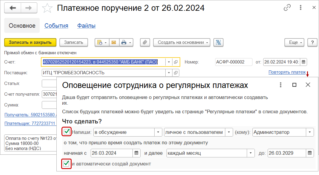 При наступлении времени регулярного платежа ассистент оповестит о необходимости создать платежное поручение или сформирует его сама.