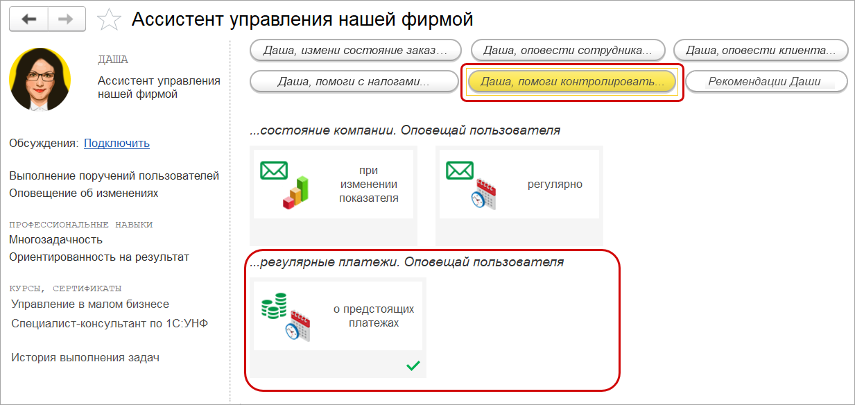 Также сделать настройки для повторяющихся платежей можно в навыках ассистента управления нашей фирмы Даши в разделе CRM.