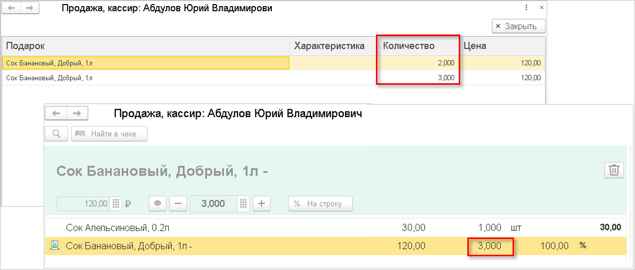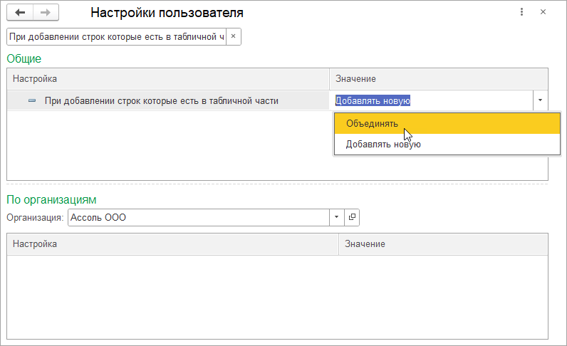 Добавить номенклатуру, которая уже есть в документе, стало проще и удобнее. Для каждого пользователя можно настроить правила добавления строк, которые уже есть в табличной части. После настройки правил при добавлении номенклатуры, которая уже есть в таблице, изменится количество в строке с аналогичным товаром или добавится новая строка.