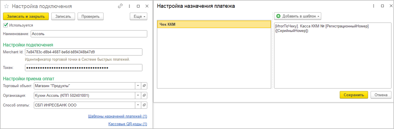 Расширили параметры шаблона назначения платежа СБП. Добавили возможность указывать регистрационный номер Кассы ККМ и серийный номер подключаемого оборудования. Настройка производится на форме настройки подключения по ссылке "Шаблоны назначений платежей". Здесь можно заполнить шаблон для каждого вида документа.