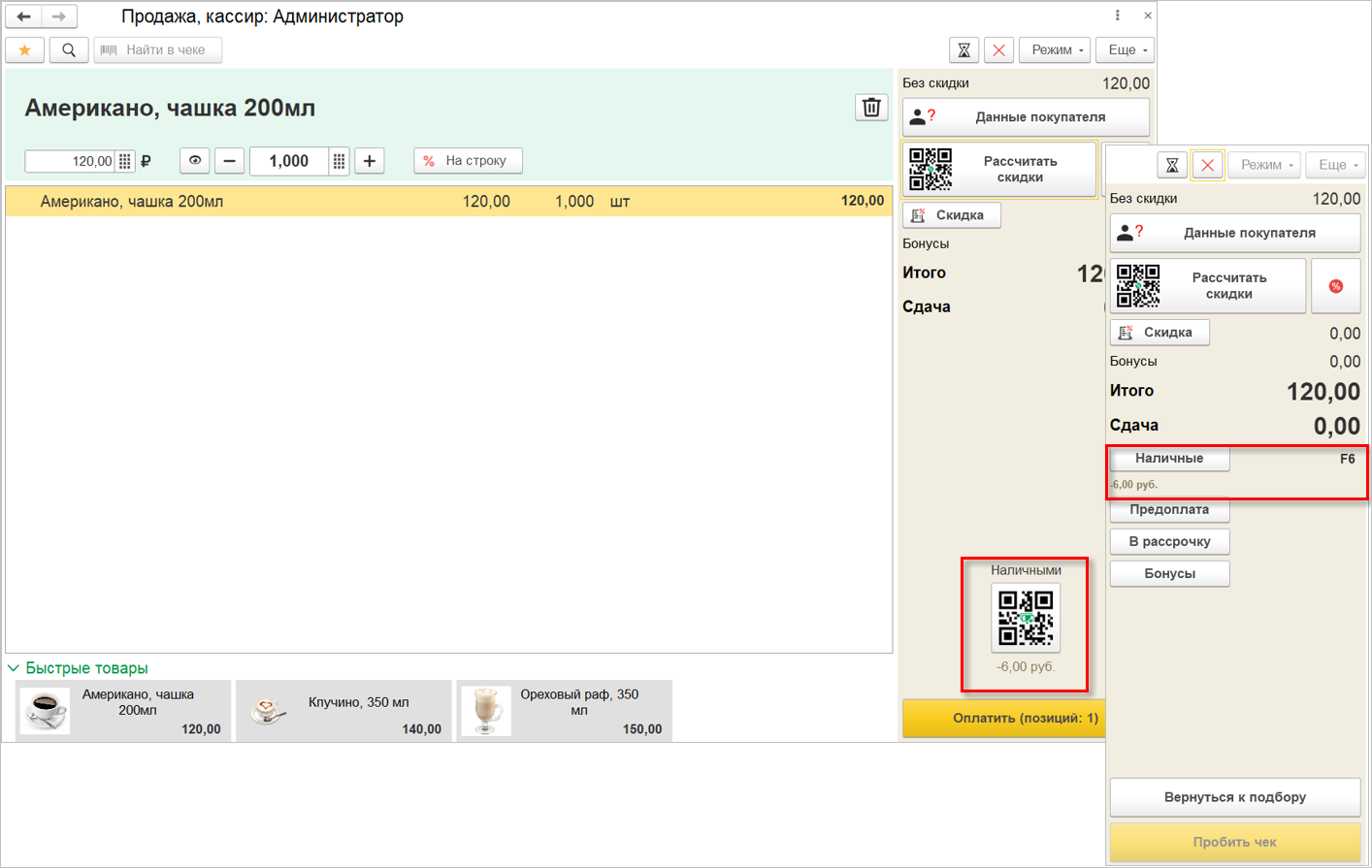 На рисунке ниже сумма скидки за вид оплаты рассчитывается 48 руб., то есть от суммы оплаты наличными. Сумма оплаты бонусами в размере 72 руб. не учитывается.