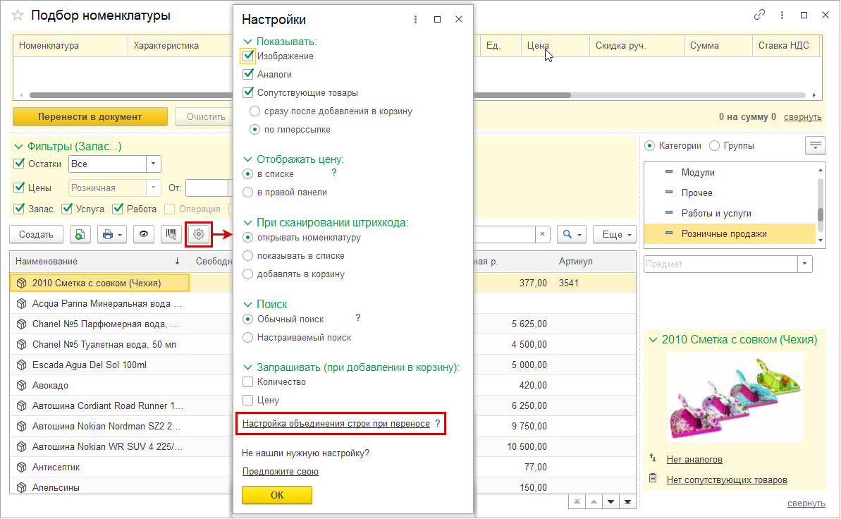 Настройка устанавливается индивидуально для каждого пользователя. Изменить ее можно в меню настроек формы "Подбор номенклатуры".