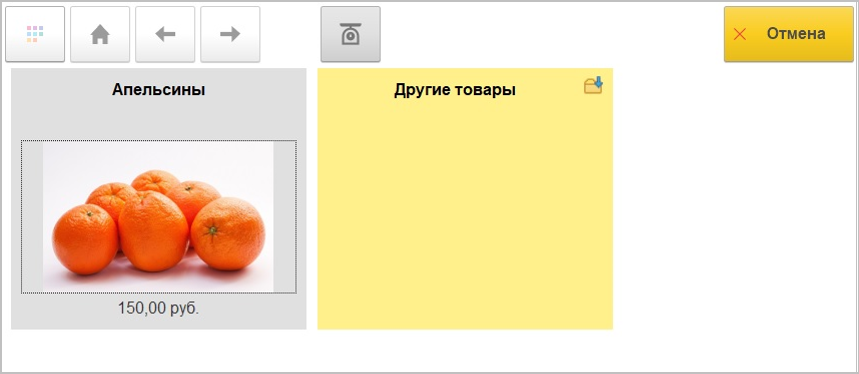 Но если весы умеют отправлять сигнал взвешивания, после того, как на них положили товар, то отбор установится автоматически. При этом распознанные товары отобразятся на экране. Если товар распознан неверно, то можно открыть группу "Другие товары" и выбрать нужный из каталога весовых товаров. Здесь же можно воспользоваться кнопкой "Отмена".