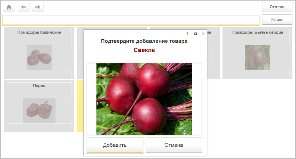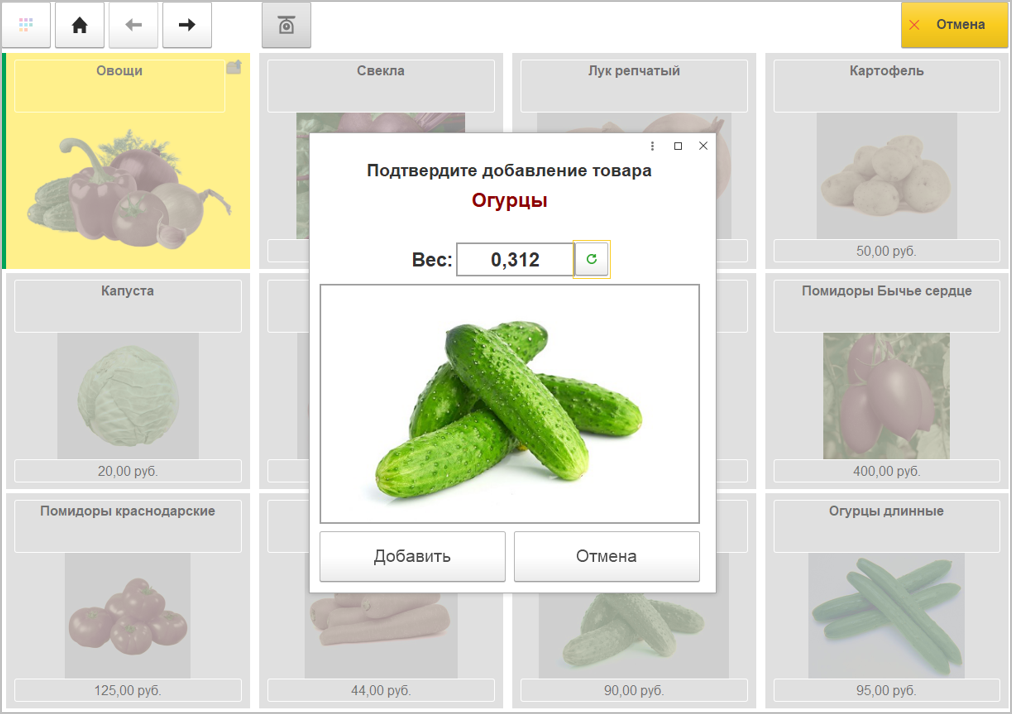 При выборе весового товара из плиточного каталога откроется дополнительная форма подтверждения, которая позволит избежать добавления товара случайным нажатием и проконтролировать вес.