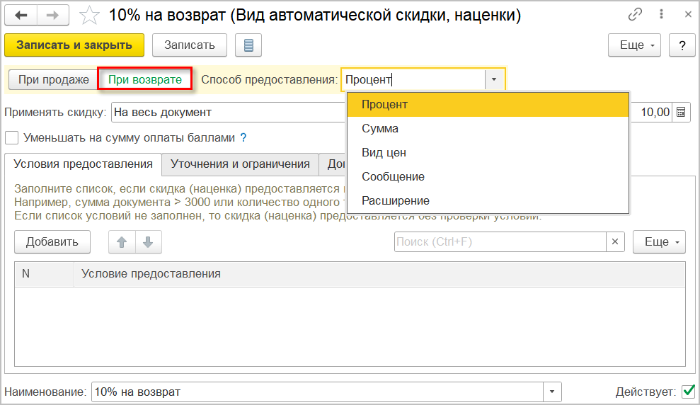 Скидки на возврат применяются только в розничной торговле, поэтому "Область применения" автоматически примет значение "Розница", без возможности правки.
