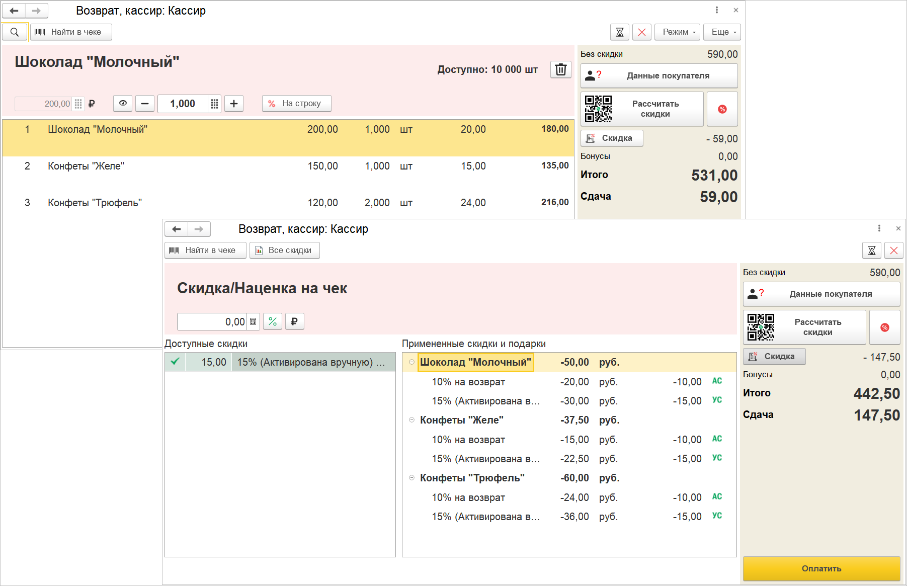 Как и при продаже, скидка на возврат может быть применена на строку и на весь документ, становятся доступны кнопки управления скидками: рассчитать/отменить скидки.