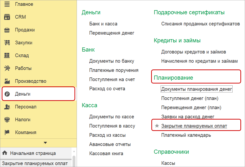 Закрыть плановый платеж можно как из платежного календаря, так и на основании любого планового документа.