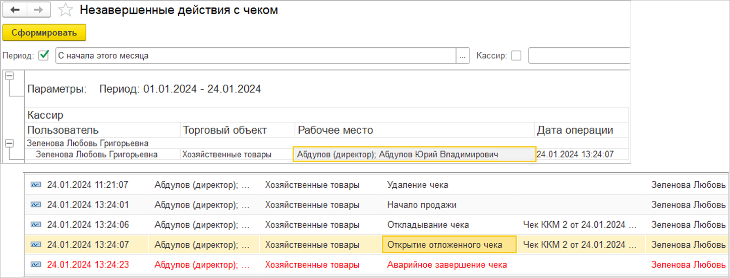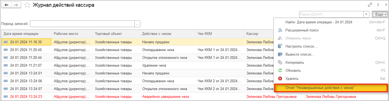 Здесь же можно перейти в сам журнал, где по времени будут отображаться все операции, которые выполнял конкретный кассир, а также записи об аварийных случаях. Для последних предназначен новый отчет "Незавершенные действия с чеком".