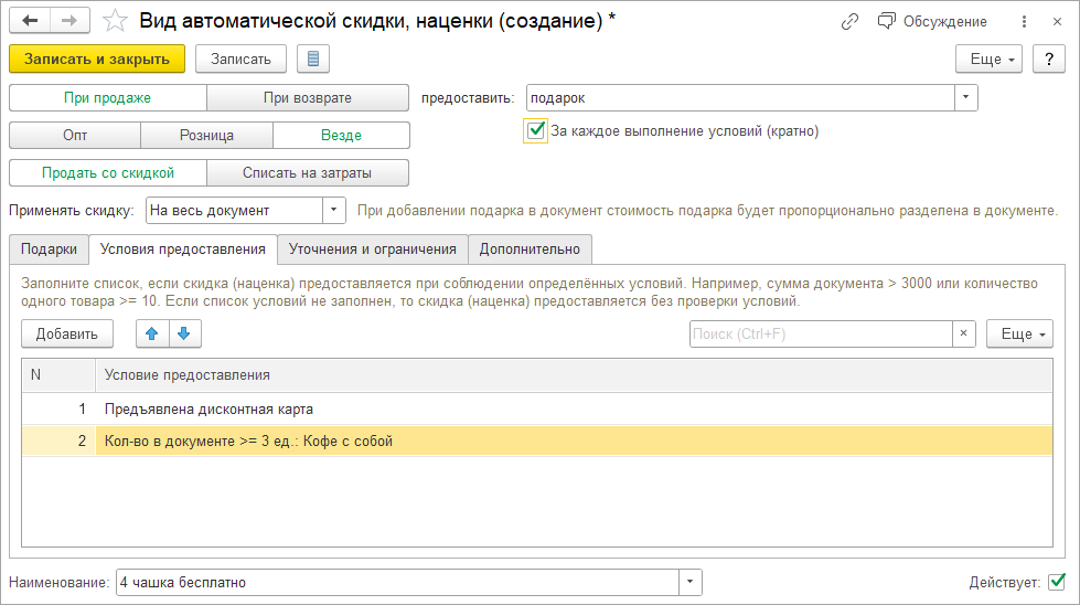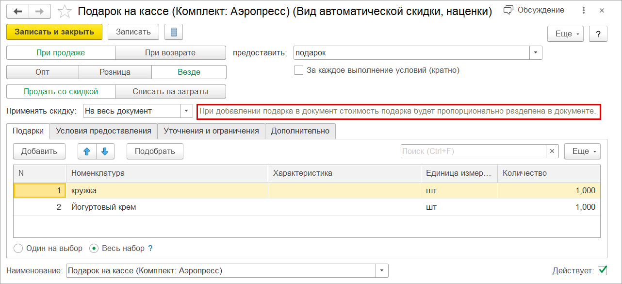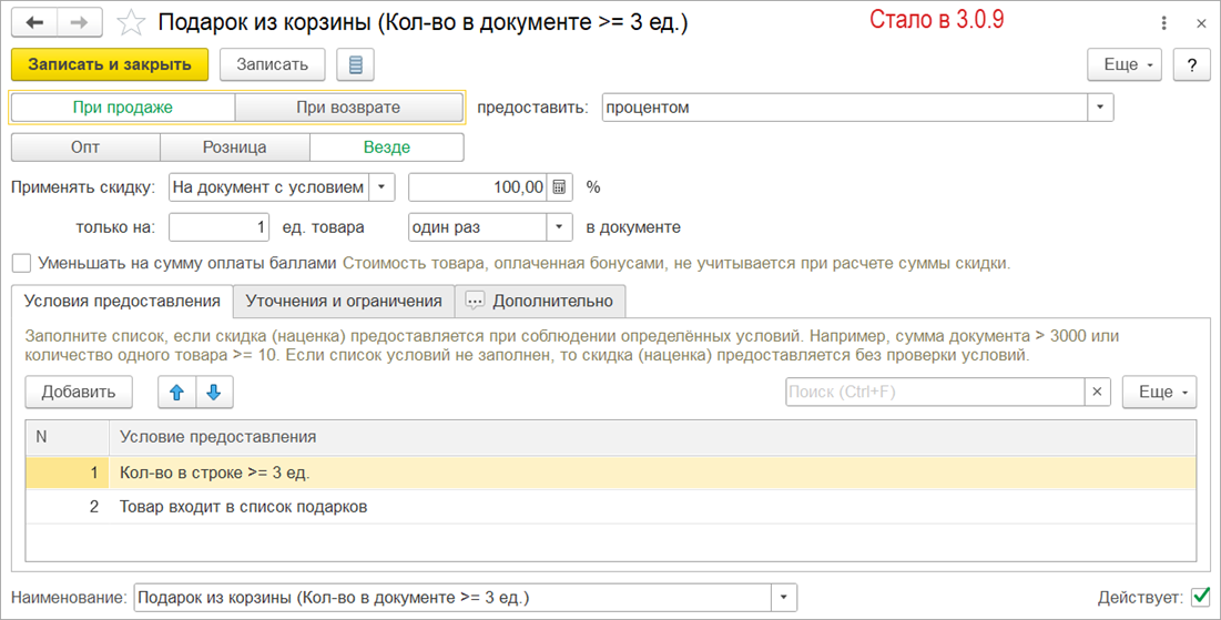 Важно! Данная скидка применяется только для подарков, выдаваемых кассиром. Для подарков, которые покупатель выбирает с витрины самостоятельно, например, в акции "3 по цене 2", теперь необходимо настраивать скидку процентом( см. Кратные скидки).