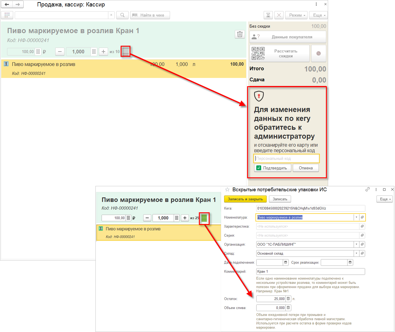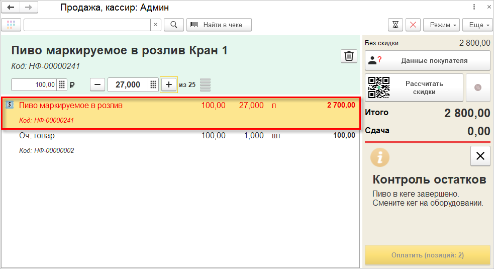 При продаже одного и того же сорта пива для каждой строки будет отображаться актуальный остаток с учетом данных корзины. На рисунке ниже из кега емкостью 30 л. сначала налили 5 литров, а потом еще 3 литра, поэтому для второй строки отображается остаток 25 л., уже с учетом первой строки. И наоборот, остаток для первой строки будет равен 27 л.