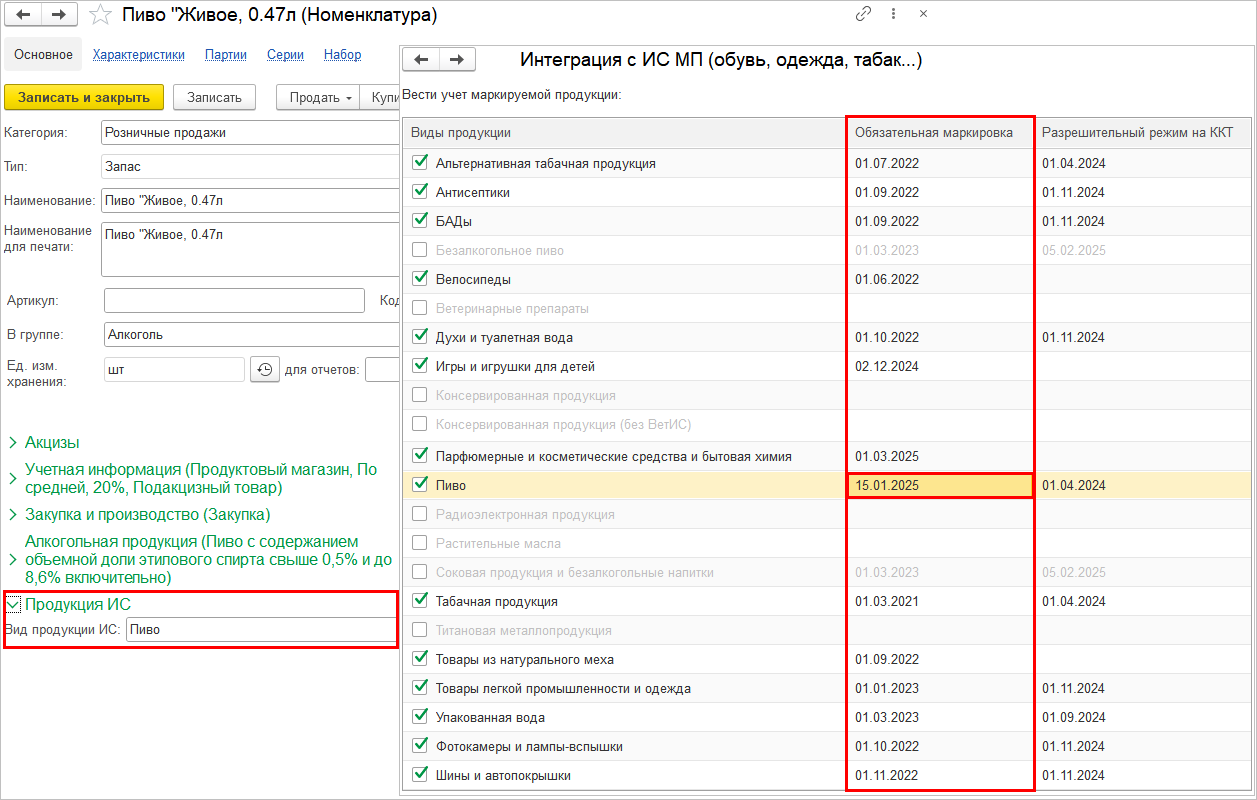 После этого останется выбрать соответствующий "Вид продукции ИС" в карточке номенклатуры или категории номенклатуры.