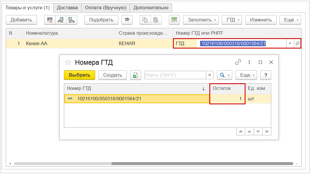 В форму выбора номера ГТД для документов реализации добавили колонку с остатком.