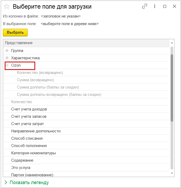 Загрузка с OZON становится удобнее. При загрузке отчетов о продаже в документ "Отчет комиссионера" можно быстро сопоставить поля, колонки данных для OZON выделены в отдельную группу.