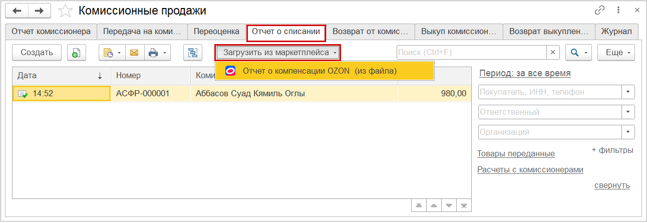 Появилась возможность загрузить отчет о компенсации из OZON за списанный или утерянный товар в документ "Отчет комиссионера о списании". В журнале комиссионных продаж появилась команда с загрузкой отчета о списании. Загрузка осуществляется аналогично отчетам о продажах. После выбора файла можно увидеть предварительные данные для загрузки. После загрузки доступны созданные документы, которые можно открыть. Информация о найденном комиссионере по ИНН автоматический заполняется.