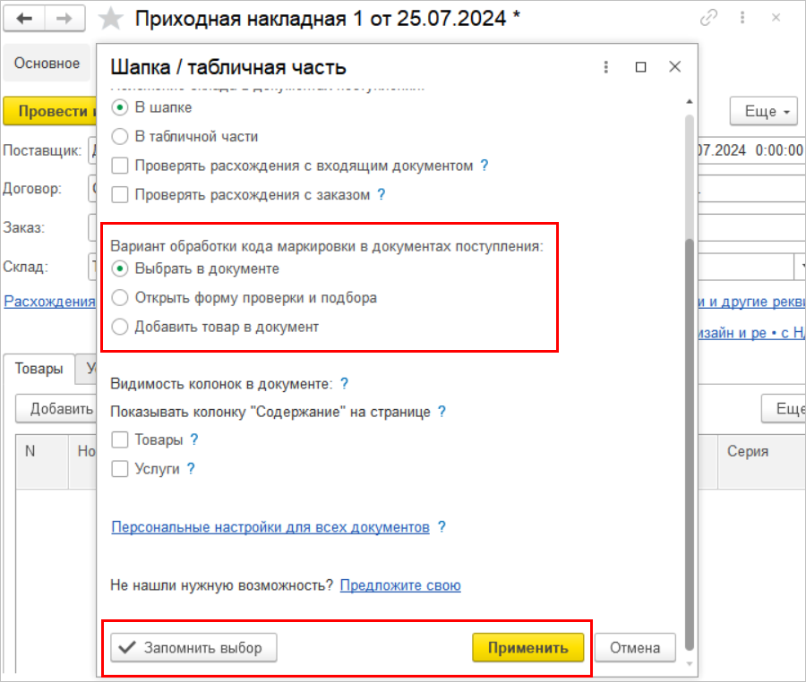 В документе "Приходная накладная" при сканировании марки можно выбрать: добавить товар или открыть форму проверки и подбора. Выбранный вариант можно запомнить для документа или сделать по умолчанию для всех приходных накладных. По кнопке "Запомнить выбор" вариант обработки будет применен для всех документов.