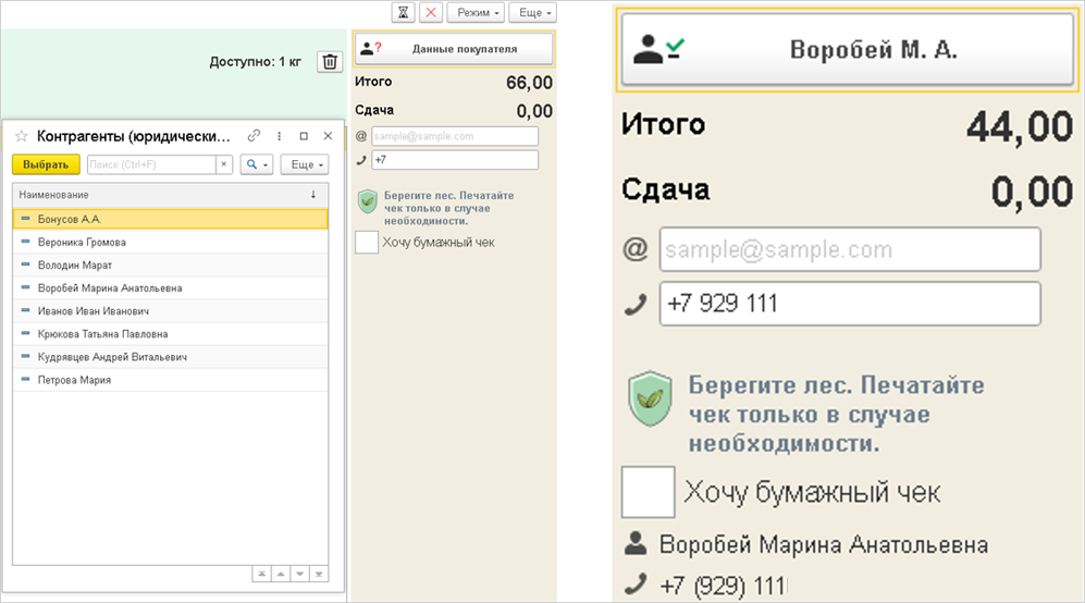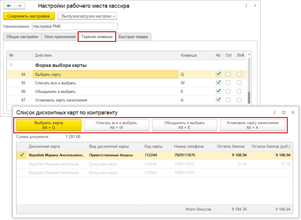 Возможность реализована в рабочем месте кассира (РМК) и документах. При сканировании карты в РМК откроется окно с результатами поиска карты и кнопками. В окне также будет отображена информация о дисконтных картах контрагента: вид дисконтной карты, код карты, номер телефона, остаток баллов и остаток баллов в рублях, рассчитанный по курсу бонусной программы. По умолчанию автоматически будет выбрана карта с наибольшим бонусным балансом.