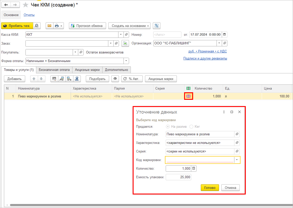 Если опция не активирована, то можно выбрать код маркировки вручную, открыв форму уточнения данных двойным щелчком по иконке с маркой.