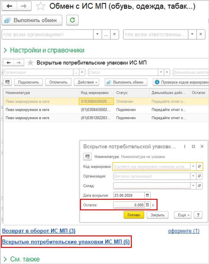 Подключение упаковки к оборудованию розлива теперь фиксируется на форме