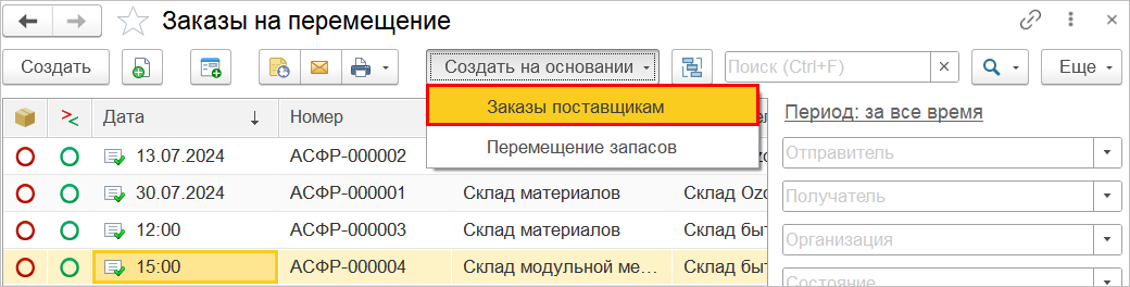 При проведении документа, запасы резервируются на складе-владельце и отмечаются к передаче на склад-получателя.