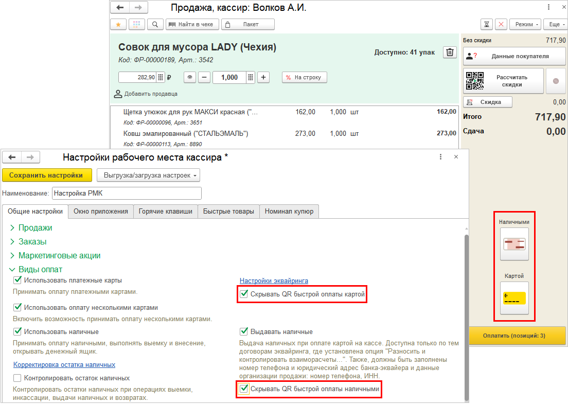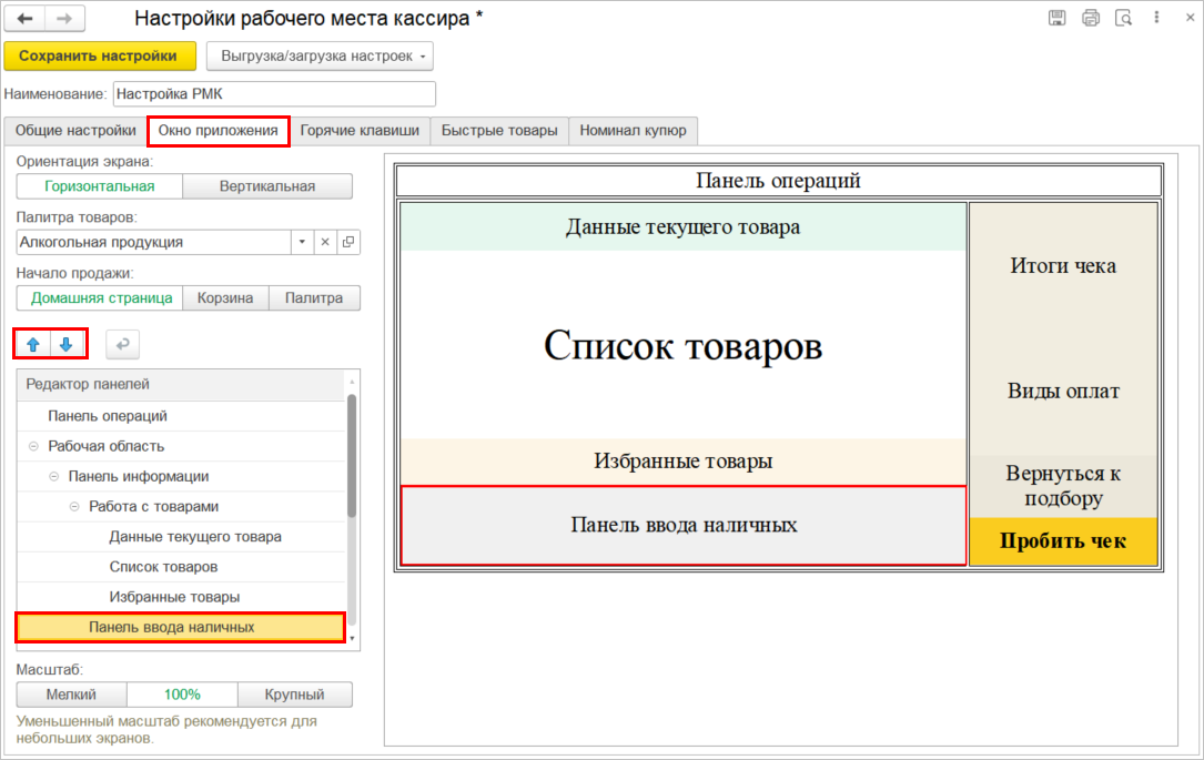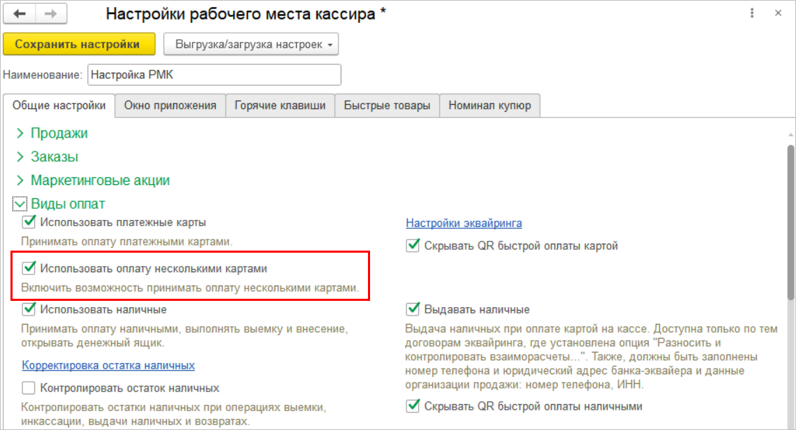 Для удобства использования на кнопки можно назначить горячие клавиши. Сделать это можно в настройках рабочего места кассира: Настройки – Администрирование – Поддержка оборудования – Настройки РМК.