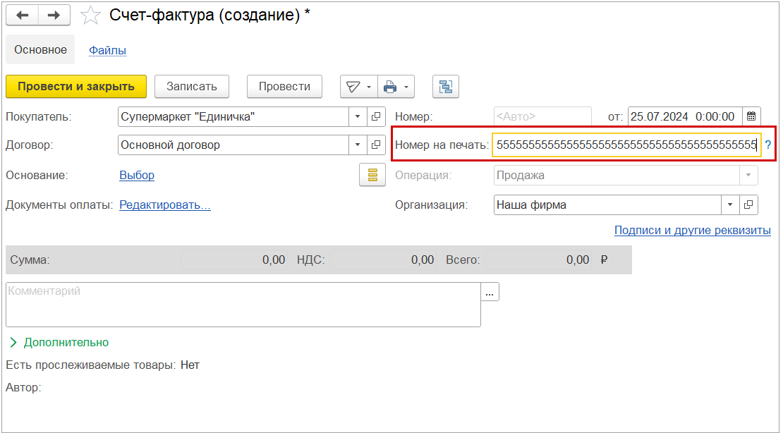 Счет-фактура с длинными номерами. Появилась возможность в счете-фактуре указать номер длиннее стандартного значения (до 50 символов). Для этого используется новый реквизит "Номер на печать", который будет использоваться при печати счета-фактуры или УПД вместо стандартного номера. Теперь можно зарегистрировать номер счета-фактуры, если товар был продан через посредника, например, маркетплейс, который выставил счет-фактуру со своим номером.