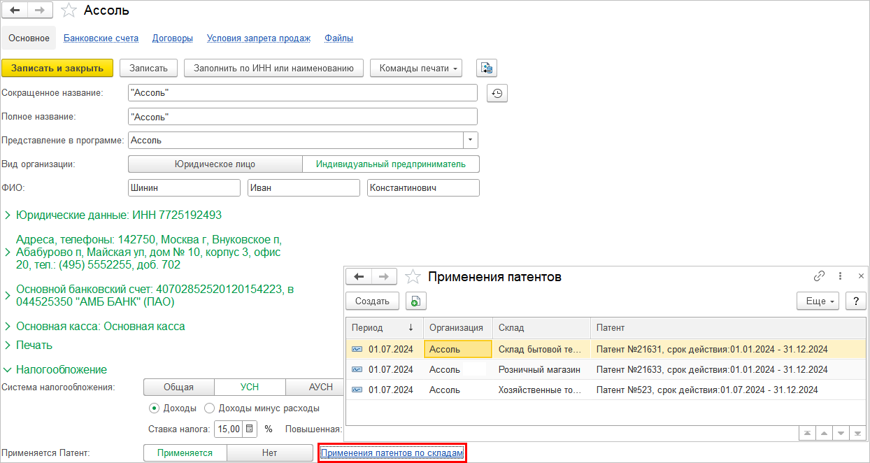 Добавили возможность настраивать распределение патентов по складам. Из карточки организации можно перейти по ссылке "Применения патентов по складам" и выбрать, для какого склада (розничного магазина) применять патент.