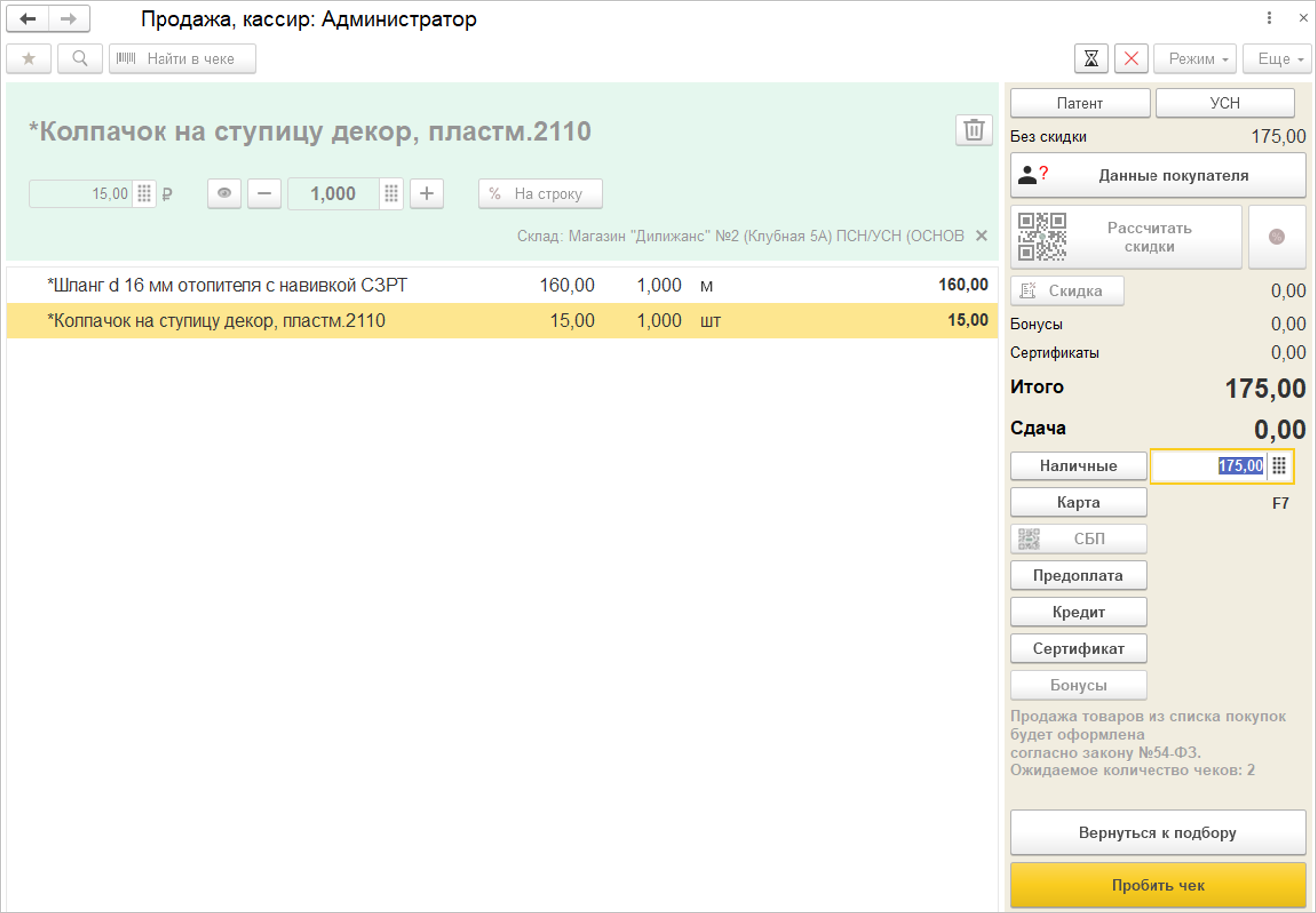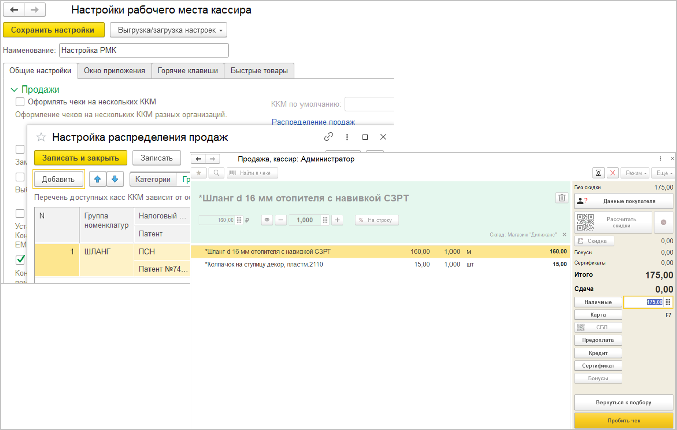 Если в РМК используется только этот склад, то по умолчанию чеки будут пробиваться с патентом. При использовании нескольких складов, продажи будут распределены согласно указанным в корзине товаров складам.